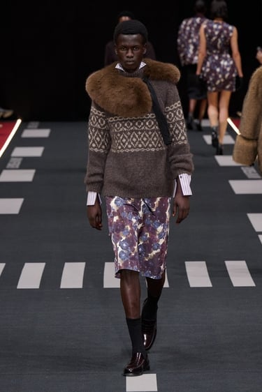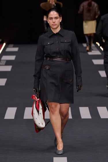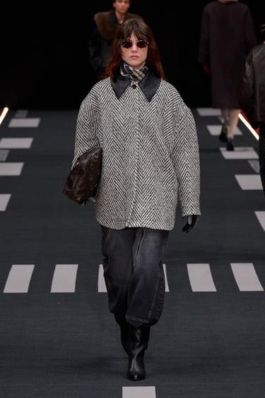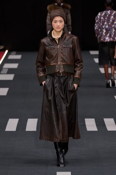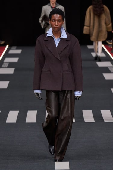 La paleta cromática refuerza este juego de opuestos. Tonos tierra profundos, marrones y chocolates dialogan con negros intensos, grises clásicos y acentos más suaves que aportan luz y textura. En cuanto a los tejidos, la marca apuesta por una mezcla rica y coherente: cuero, lana, terciopelo, sastrería tradicional y seda, siempre tratados desde una óptica contemporánea.