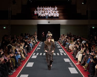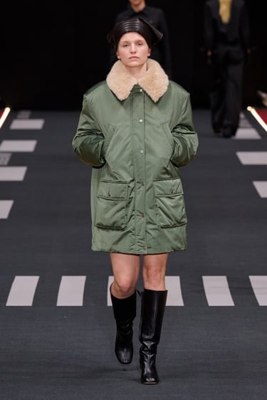 El espacio elegido para el desfile, el imponente Idrætshuset, reforzaba el relato desde el primer momento. Su amplitud evocaba un hangar aeronáutico y la pasarela, marcada por líneas blancas, se transformaba simbólicamente en una pista de despegue. La experiencia se completaba con un delicado coro femenino infantil, cuyas voces envolvían la sala y aportaban una dimensión emocional, casi etérea, al conjunto.