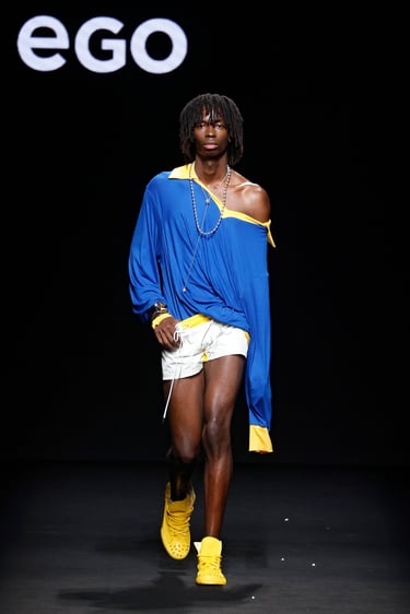 En “Cop4cab4na”, Joan Ribas estira el rango cromático hacia propuestas vibrantes. En paralelo a una base neutra —blancos, grises y negros— aparecen estallidos de amarillo eléctrico y azul eléctrico que rompen con lo habitual y ofrecen contraste dramático. Estos tonos brillantes bailan sobre la neutralidad, generando tensión estética entre lo cotidiano y lo evolutivo. Además, el azul eléctrico se ha convertido en tono simbólico dentro de la marca, adoptado incluso por referentes del ámbito musical como Aitana.