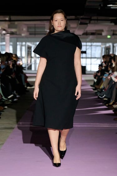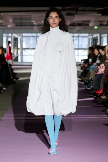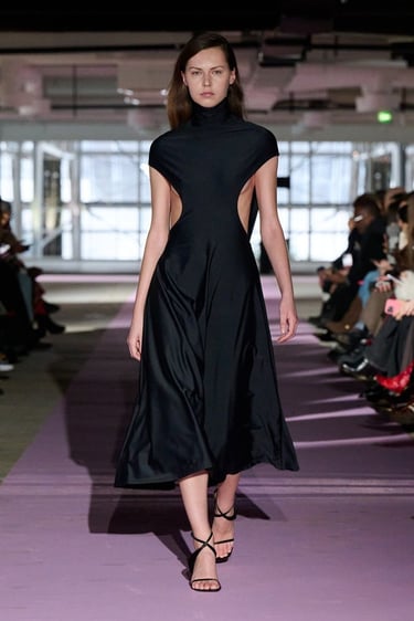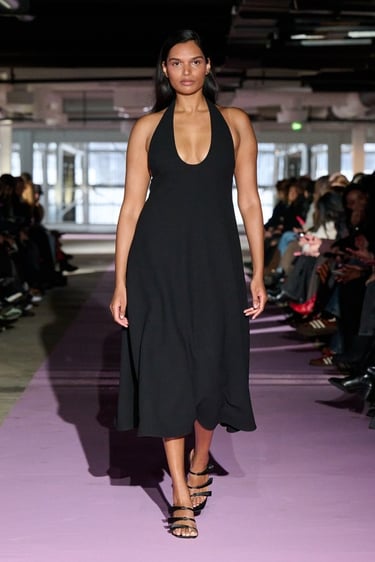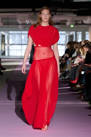 Las siluetas se articulan desde una concepción claramente arquitectónica. Vestidos con peplum y cuellos con volantes elevados en malla translúcida conviven con trajes sastre de cintura marcada, gabardinas envolventes y vestidos halter de líneas limpias, capaces de transmitir seguridad y sensualidad sin artificios. Los característicos cortes tipo sujetador y los plisados ribeteados de cintura baja, ya convertidos en códigos identitarios de la marca, aportan tensión visual y precisión técnica a piezas de apariencia minimalista.