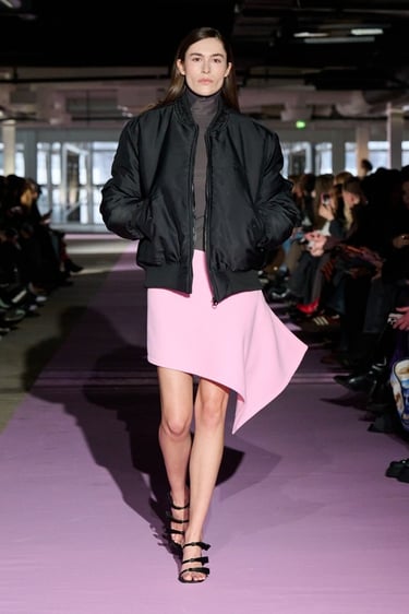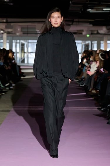 La puesta en escena, sobria y contenida, refuerza la narrativa. En un espacio industrial depurado, las modelos desfilan sobre una alfombra rosa pálido, estableciendo un delicado diálogo cromático con las prendas. La paleta de color, uno de los sellos distintivos de la firma, se mueve entre tonos burdeos profundos, marrones chocolate, grises suaves, negros rotundos y delicados matices empolvados, creando un equilibrio perfecto entre fuerza y sutileza.