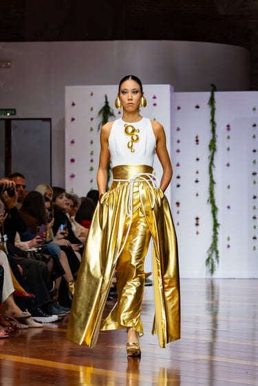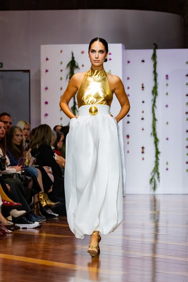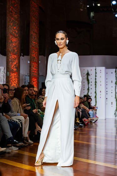 En ADN la elección del tejido es palabra y silencio: raso de seda que fluye, crepé que marca el contorno, punto delicado que acaricia la piel, e incluso neopreno como guiño contemporáneo que demuestra que la costura no debe temer la modernidad. Los bordados en oro y plata se alzan como piezas de joyería textil, realizadas a mano por artesanos expertos, horas de trabajo que se traducen en brillos sutiles, relieves elegantes y texturas con memoria. La tradición del bordado español se reinterpreta para crear volúmenes, contrastes y profundidad en cada vestido.