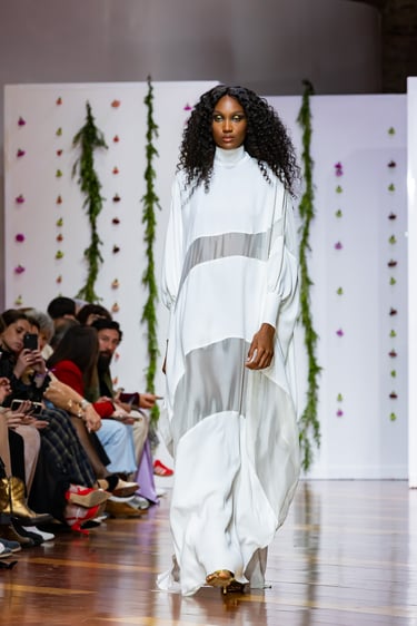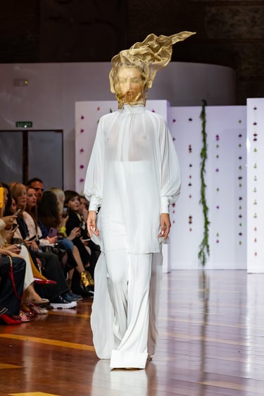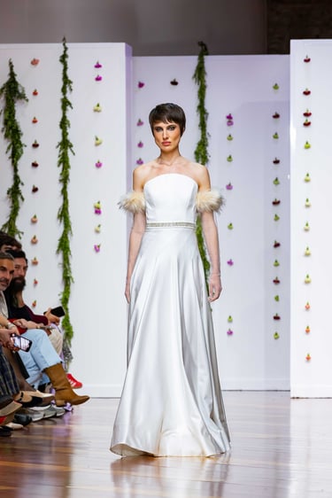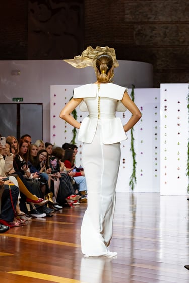 La colección se completó con los tocados de Elena Fajardo, artesana de la sombrerería de alta gama que aporta un contrapunto de carácter al universo sereno de Urquízar. Diademas inspiradas en art déco, estructuras más vanguardistas: cada pieza dialoga con las líneas de los vestidos, reforzando esa idea de “coordinate” entre cuerpo, vestido y ambiente.