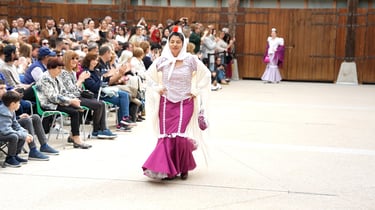 Por su parte, Talleres Riaza introduce una lectura más contemporánea sin traicionar la raíz. Sus propuestas exploran nuevas combinaciones cromáticas desde tonos empolvados hasta guiños más vibrantes y tejidos que suavizan la rigidez tradicional, incorporando texturas más fluidas. Aquí, el traje chulapo se expande, se flexibiliza y dialoga con una generación que busca identidad sin renunciar a la modernidad.