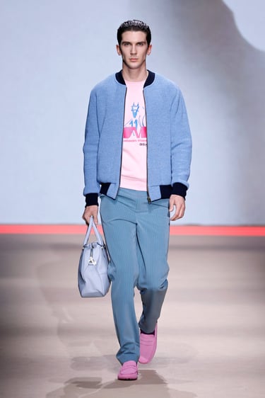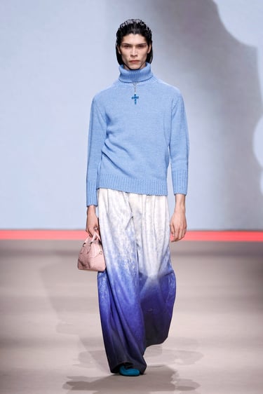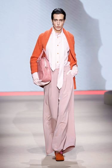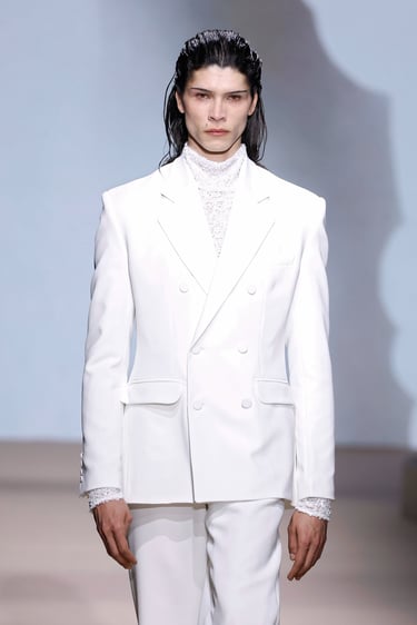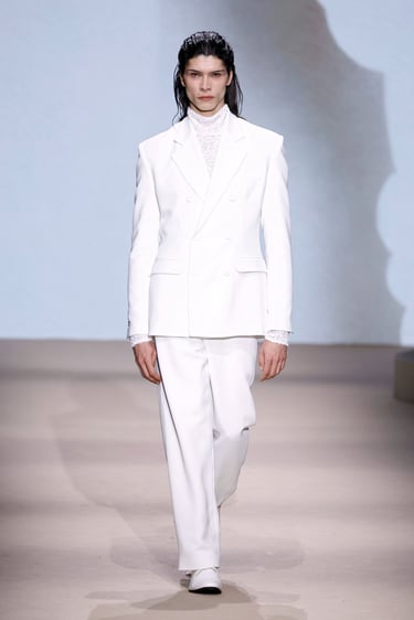La colección se articula en torno a una tensión constante entre opuestos. La estructura impecable, casi arquitectónica convive con la fluidez de tejidos que acarician el movimiento. Chaquetas de líneas depuradas abrazan el torso con precisión, mientras pantalones amplios y capas ligeras introducen una cadencia suave, casi etérea. Es en ese diálogo donde la firma encuentra su punto de sofisticación: una elegancia que no impone, sino que sugiere.