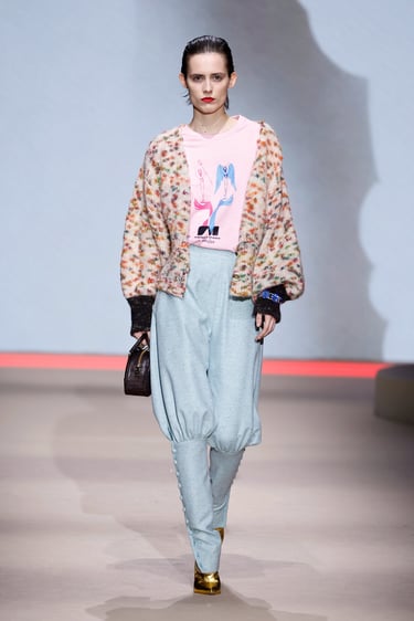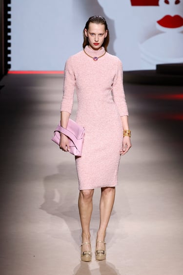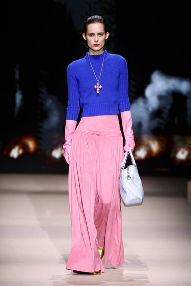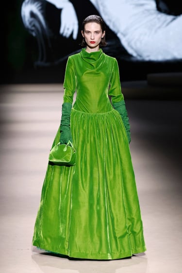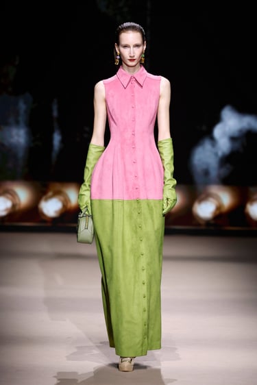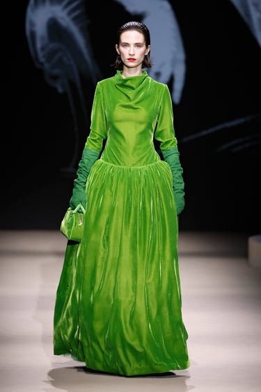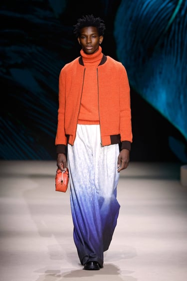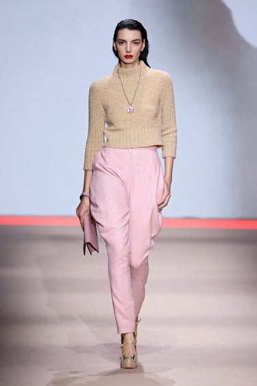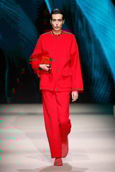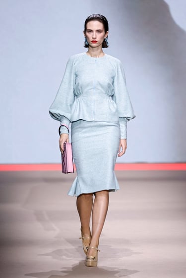 En cuanto a los materiales, Maison Mesa vuelve a demostrar su maestría en la selección textil. Lanas nobles, sedas con caída líquida, crepés y jacquares construyen un paisaje táctil donde el lujo se percibe en la sutileza. Las texturas dialogan entre sí, generando profundidad visual sin caer en la estridencia, un sello inequívoco de la casa.