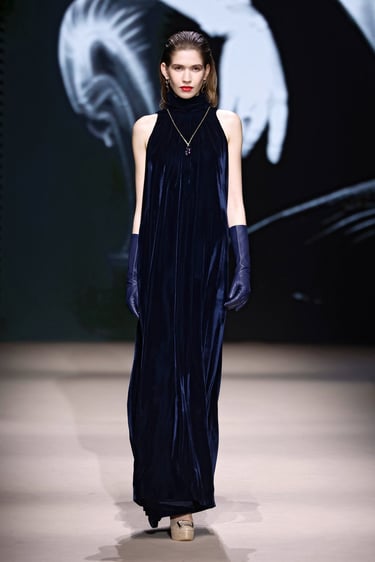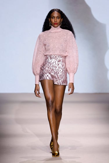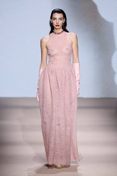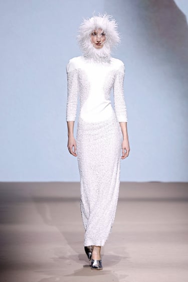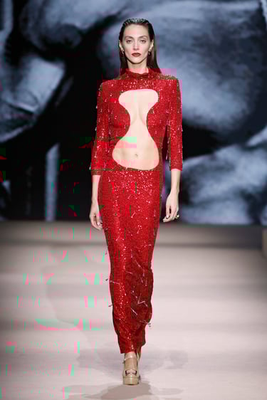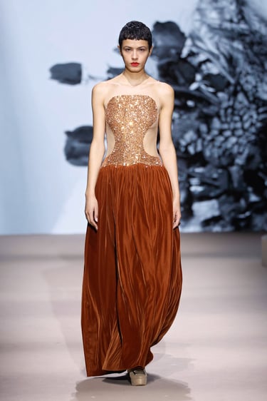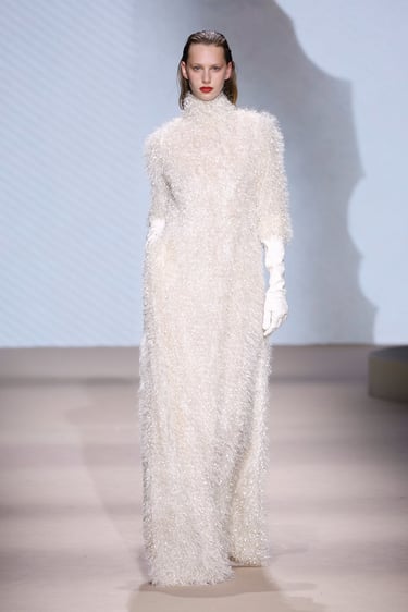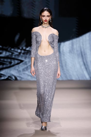 Las siluetas, por su parte, se convierten en vehículo narrativo. Abrigos de trazo limpio que rozan lo escultórico, transparencias estratégicas que insinúan sin revelar, y bordados discretos que aportan dimensión sin sobrecargar. Cada look se percibe como un capítulo de una historia mayor: la de una identidad en constante construcción.
