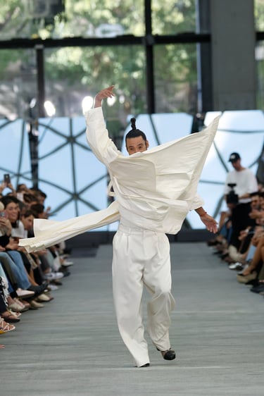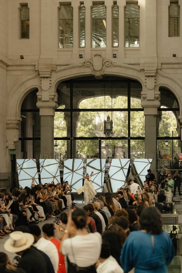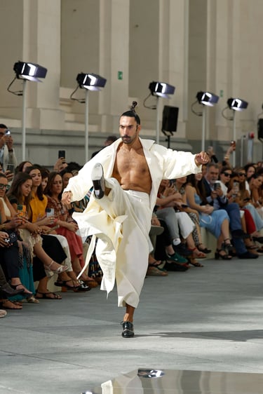 El desfile, celebrado en la Galería de Cristal del Palacio de Cibeles, se abrió con la fuerza del bailaor Eduardo Guerrero, que preludió una colección donde el movimiento se convirtió en protagonista. Entre el público, rostros de la cultura, el deporte y la moda acompañaron un regreso que reafirma a la firma como un referente de la moda de autor española.