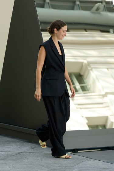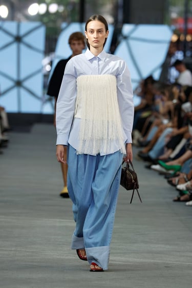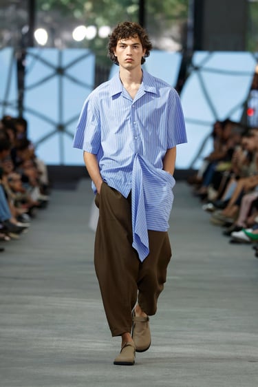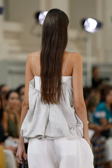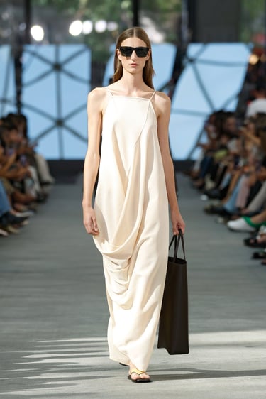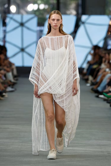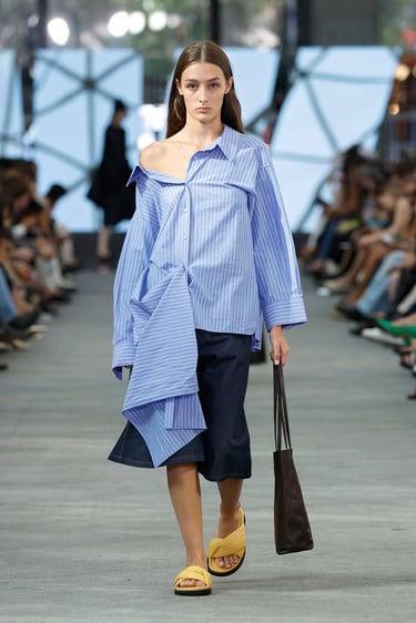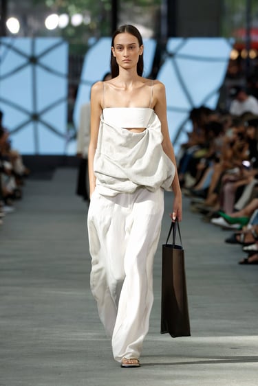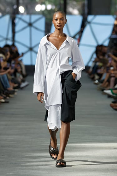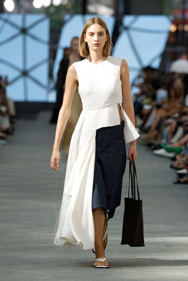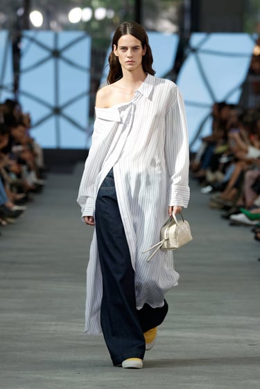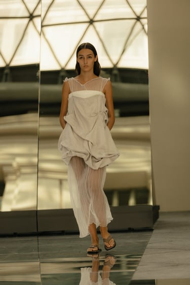 “Zenit” alude al punto más alto, ese instante de plenitud al que se llega tras un viaje de soltar y acumular. Bajo esta metáfora, la colección propone prendas que liberan el cuerpo a través de un patronaje experimental, desafiando la estructura clásica: una falda que se descuelga de la cinturilla para crear un drapeado inesperado, mangas que caen suavemente del hombro o camisas que parecen desprenderse en un gesto de ligereza.
