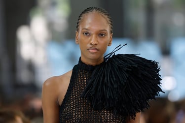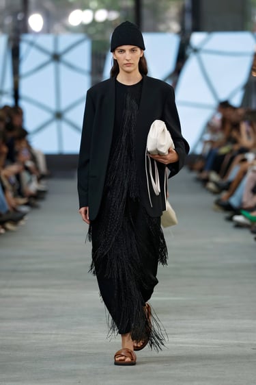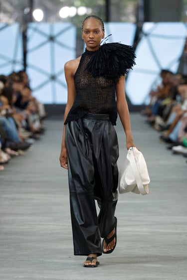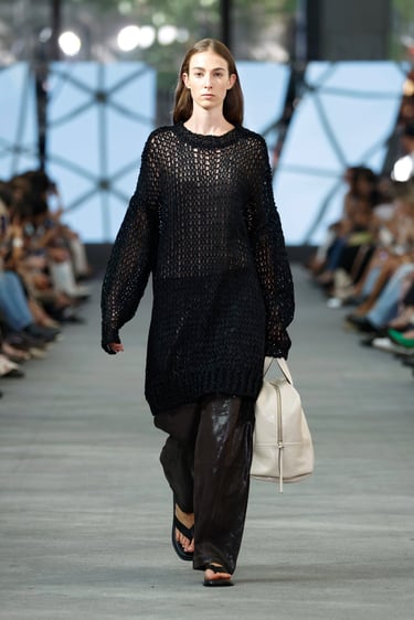 En contraposición, la otra cara de la narrativa aparece en las puntadas eternas, bordados que se repiten como símbolo de constancia y esfuerzo. Una chaqueta que conserva hilos colgantes a modo de fleco o un vestido de punto negro intervenido con gruesa hilatura de cupro materializan ese trayecto de acumulación que también construye el ascenso.