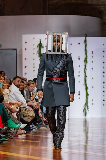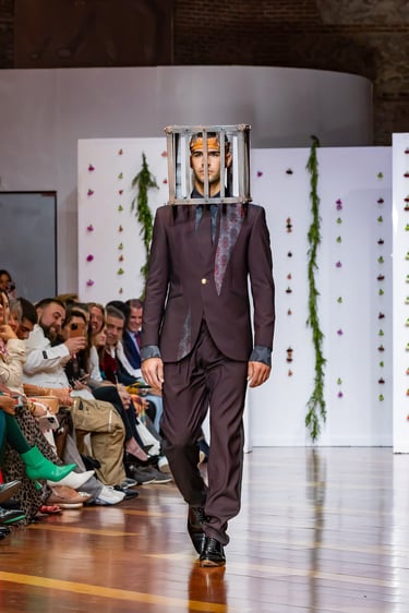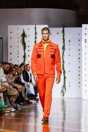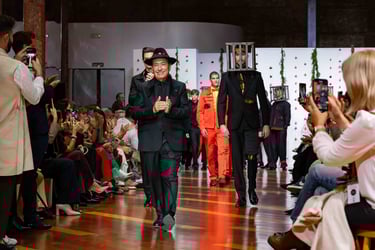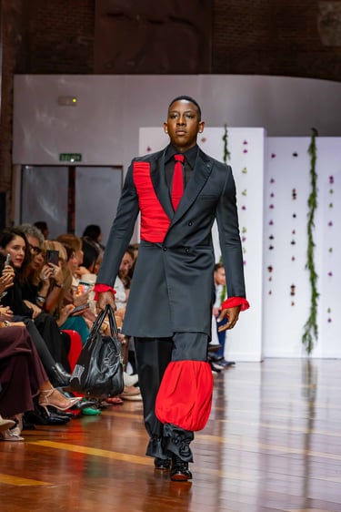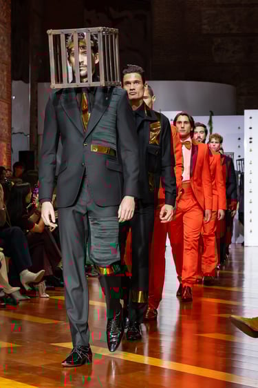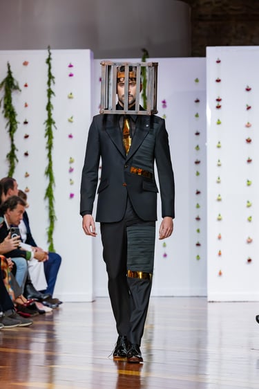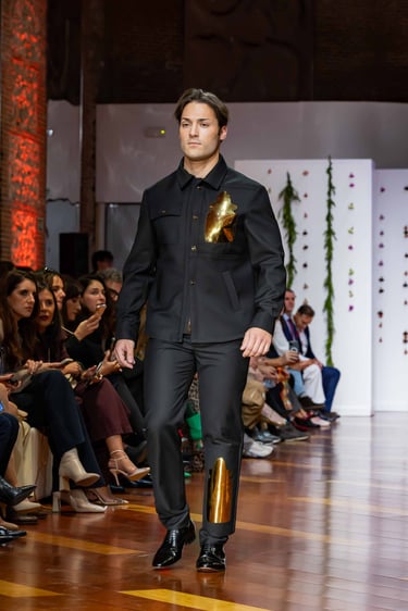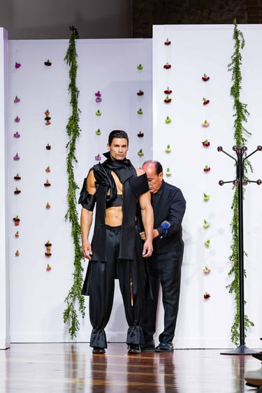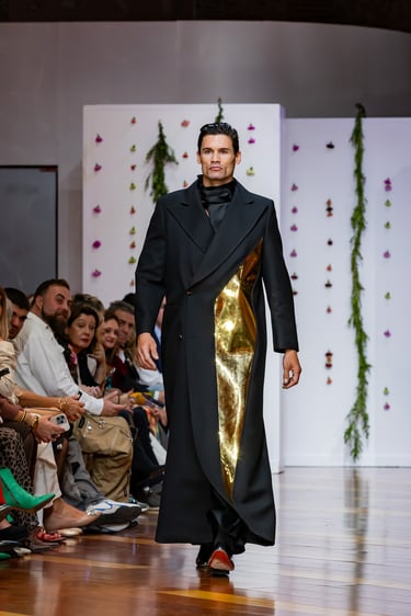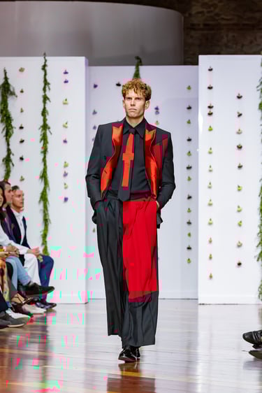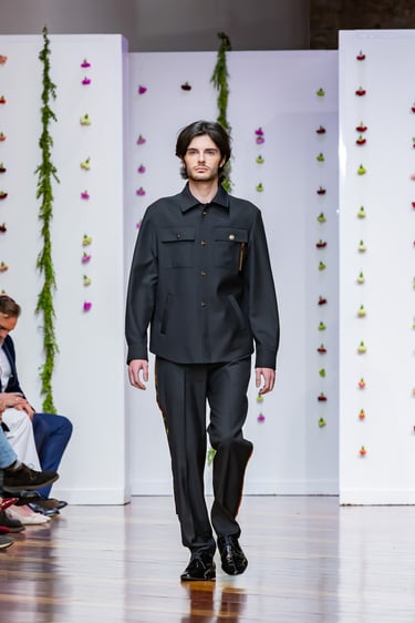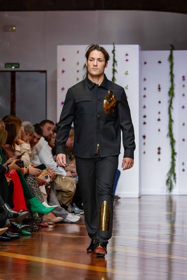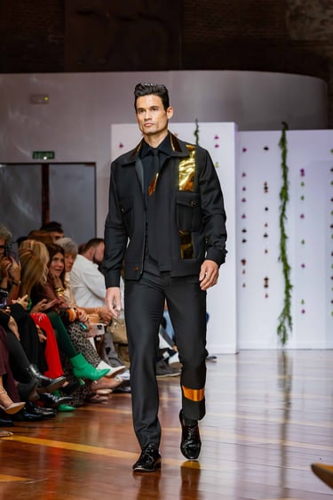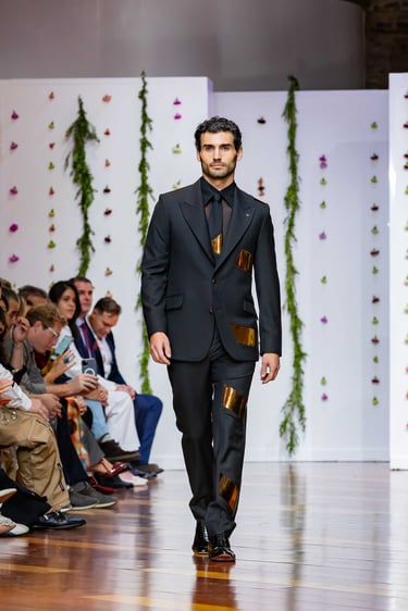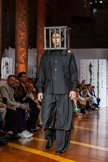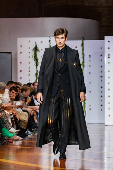 Esta colección articula una sastrería ritual, donde las piezas clásicas —smokings, semilevitas, trajes de líneas alargadas— se reinterpretan con giros contemporáneos: bombers en silueta híbrida, chaquetas cruzadas de patrón arquitectónico y drapeados que evocan el pliegue de una túnica monástica.