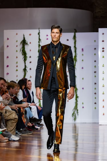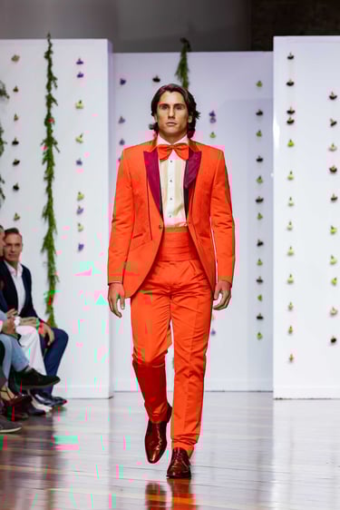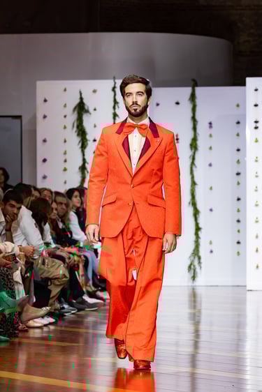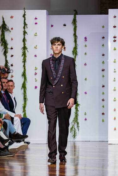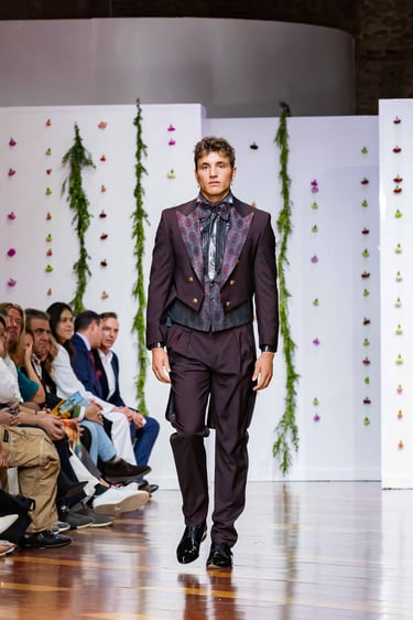 En cuanto a los tejidos, la colección juega con materiales nobles y contrastes de textura: lanas de caída limpia, sedas suaves, microfibras naturales, terciopelos discretos, tul y chiffon para forros o detalles. Esta combinación aporta estructura, fluidez y matiz al diseño masculino, al tiempo que mantiene el sello artesanal que distingue a Félix Ramiro.