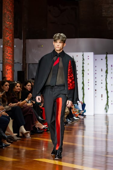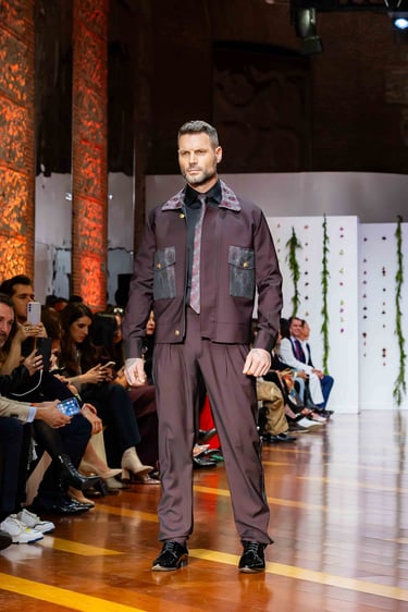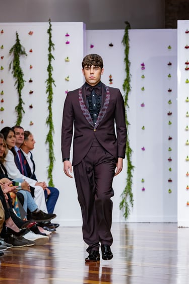 El cromatismo de “Monasterio” se inclina por tonos que conjugan la austeridad espiritual con la profundidad del masculino moderno. Destacan el negro carbón, el burdeos intenso, el rojo rubí y los toques de oro pálido o satinado, símbolos de fuerza, solemnidad y refinamiento.