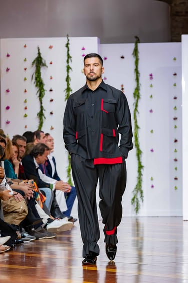 Con la precisión que le caracteriza, el taller de Félix Ramiro aborda cada pieza con minuciosidad: frunces que remiten a los pliegues de un hábito, drapeados que imitan el recogimiento, cortes alargados que estilizan sin perder presencia masculina. La mezcla de tradición (sastrería, patrones clásicos) y vanguardia (tejidos híbridos, siluetas reinterpretadas) define el ADN de la colección.