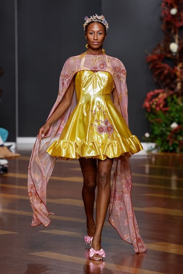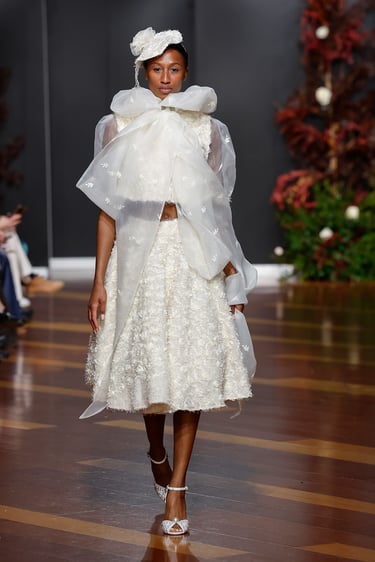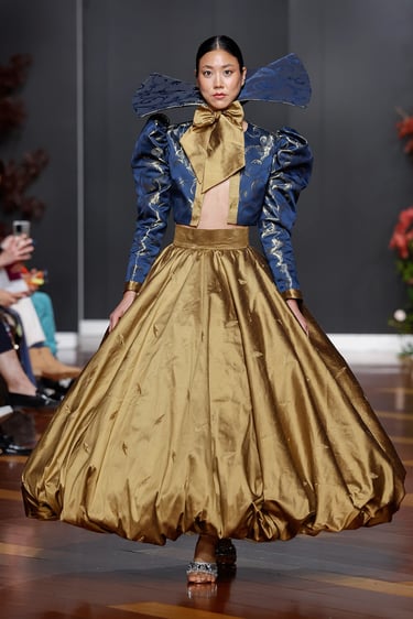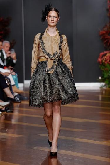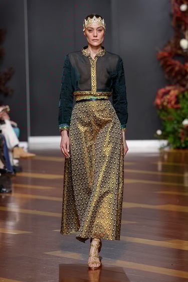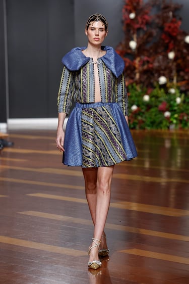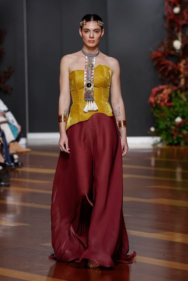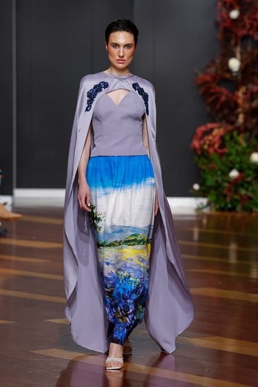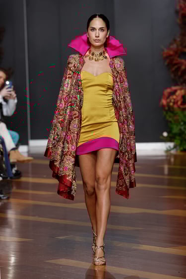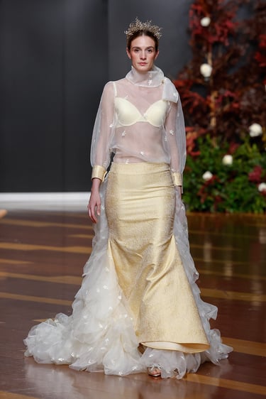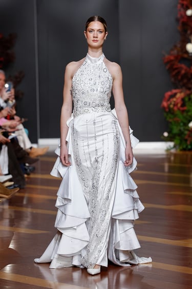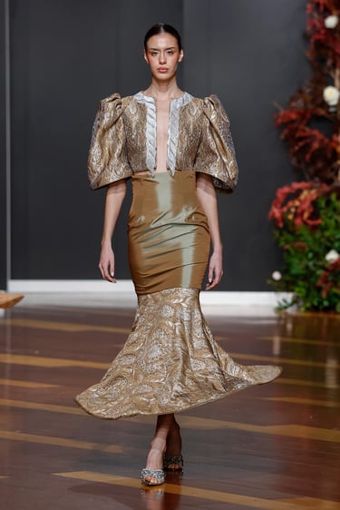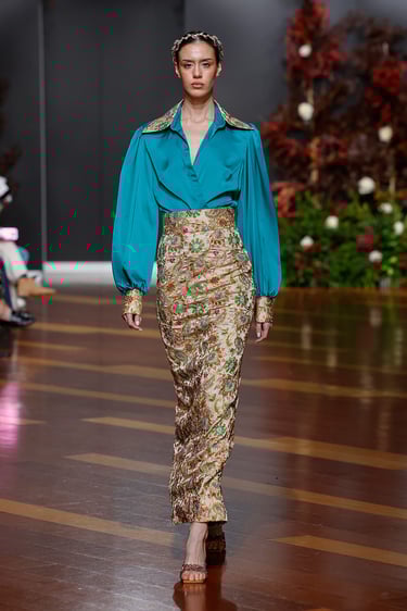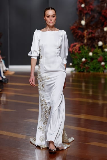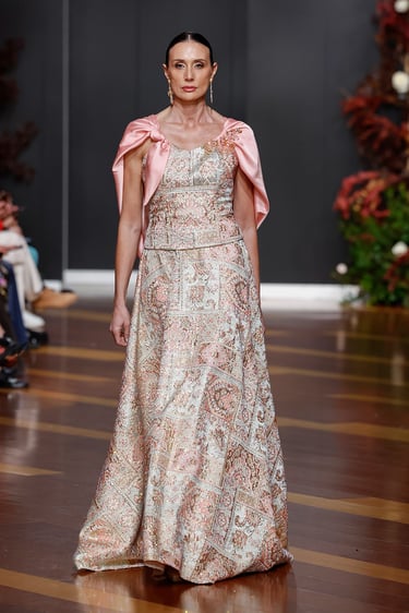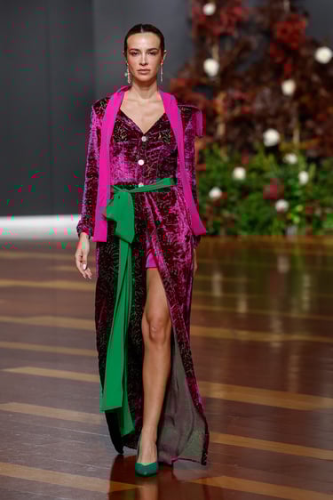 La riqueza textil, sello indiscutible de la firma, se convierte en protagonista absoluta. Terciopelos profundos, sedas fluidas y brocados de carácter pictórico construyen un relato táctil que dialoga con una paleta cromática sorprendente en el universo bridal. Lejos de limitarse al blanco tradicional, la colección explora matices que oscilan entre ocres cálidos, rosas empolvados, fucsias vibrantes, verdes esmeralda y destellos dorados, culminando en el icónico blanco nupcial, reinterpretado con delicados dibujos pintados a mano que elevan cada pieza a obra única.