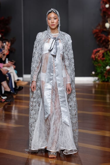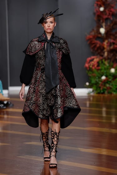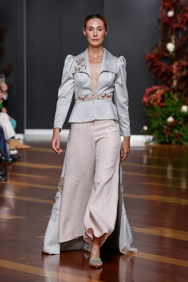 El desfile, envuelto en una atmósfera íntima y profundamente emocional, se vio enriquecido por la actuación musical en directo de Da Capo Music, cuya interpretación aportó una dimensión sensorial que intensificó la experiencia, convirtiendo la presentación en un auténtico viaje entre la moda y el arte.