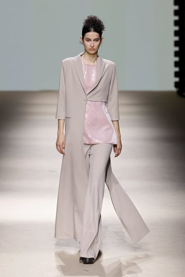 La paleta cromática refuerza esta narrativa de sofisticación contenida. Los tonos neutros, beige, arena, marfil, construyen una base serena sobre la que el negro aporta profundidad y carácter. A modo de acento, irrumpen delicados matices de rosa palo y azul hielo, iluminando los estilismos con una sutileza casi pictórica.