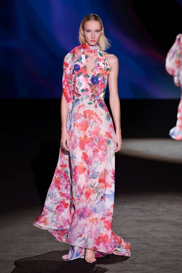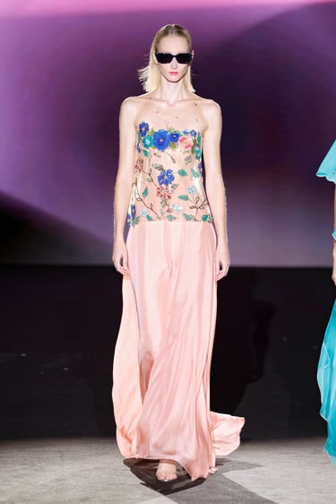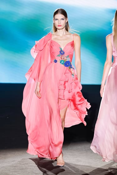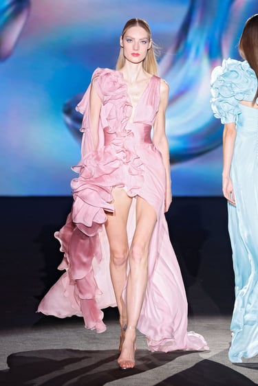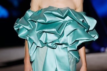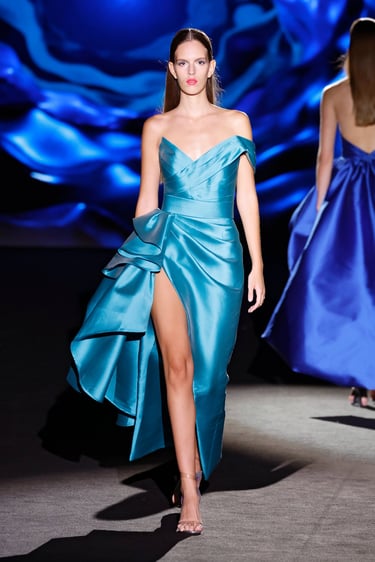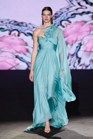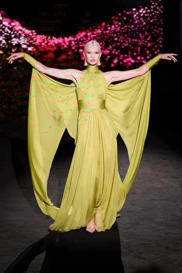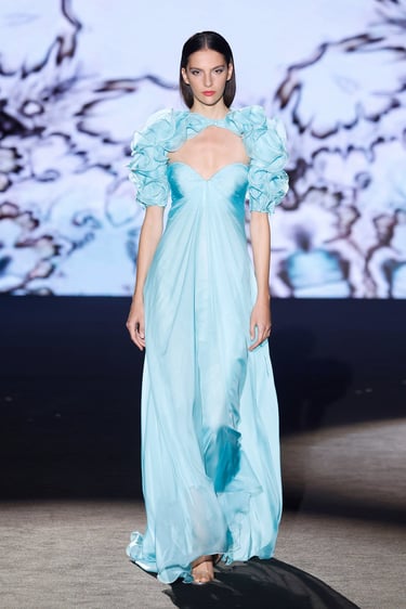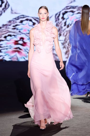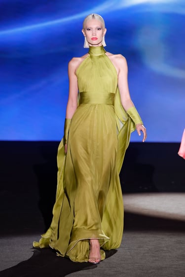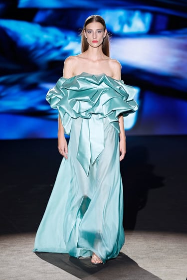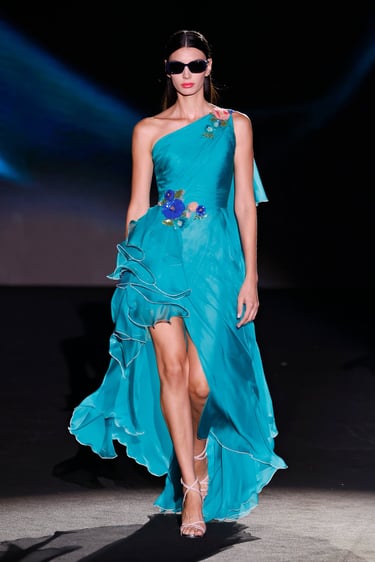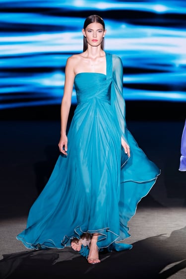 Desde sus primeros pasos en 1987, Hannibal Laguna ha cultivado una estética que abraza lo femenino con formas refinadas y siluetas que danzan entre lo clásico y lo contemporáneo. Artesanías tradicionales, patronaje preciso, volúmenes estudiados, drapeados y plisados son algunos de sus sellos más reconocibles. En Lazuliflow, esos elementos se manifiestan a través de bustiers ceñidos, capas, túnicas que recrean la libertad del vuelo, cortes inspirados en la Antigua Grecia que envuelven el cuerpo con soltura y gracia.