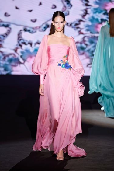 No basta con la forma si el material no la acompaña. Bajo esa premisa, Laguna apuesta por tejidos ligeros, etéreos, con alma. En esta propuesta se cuentan la seda natural, el mikado (ese tejido con cuerpo que permite estructurar sin rigidez extrema), tafetán, gasas traslúcidas y organzas de efecto acuoso. Los bordados, realizados a mano, sobre tul invisible, añaden un toque casi de fantasía —como flores suspendidas sobre agua— que parte de la paciencia y del dominio técnico.