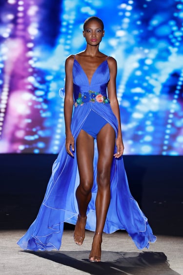 El color es protagonista absoluto en Lazuliflow. Laguna centra esta colección en sus múltiples azules: desde los tonos más intensos y profundos, que evocan océanos secretos, hasta los más ligeros, casi transparentes, que sugieren marea, reflejo y calma. Este azul actúa como hilo conductor, pero no está solo: se acompaña de matices que surgen del contraste con transparencias, detalles bordados, y la luz que reflejan los tejidos. Es una paleta que no teme la profundidad, pero tampoco el aire de ligereza.