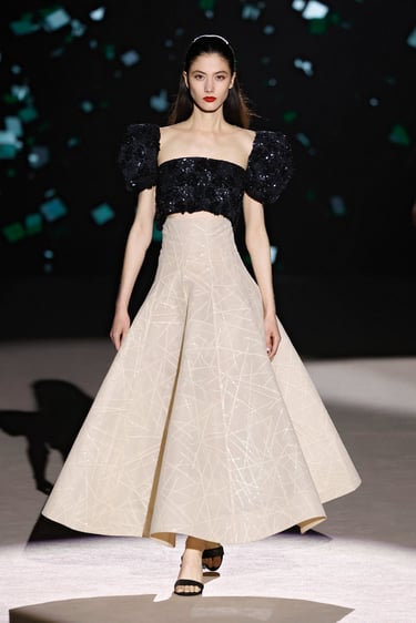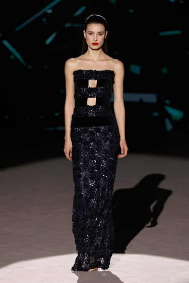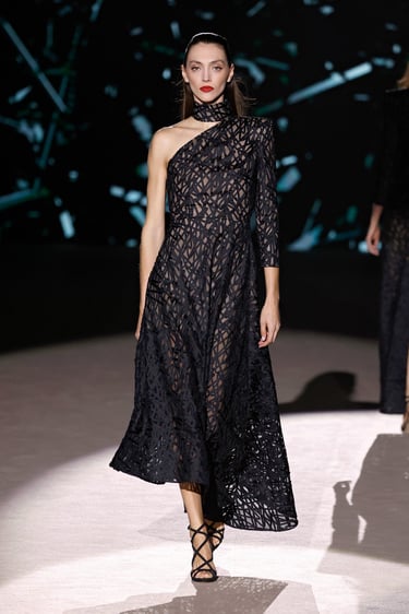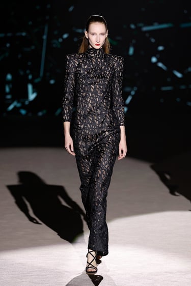 Inspirado en la idea artística del negro como generador lumínico, el diseñador explora un juego constante entre superficies mates y destellos sutiles. Relieves, brillos contenidos y texturas enfrentadas convierten cada look en un paisaje visual en movimiento.