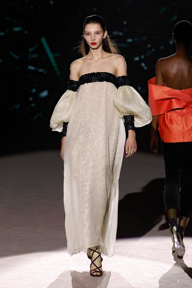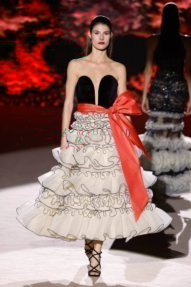 Mangas esculturales, cortes estratégicos y drapeados milimétricos revelan ese dominio técnico que caracteriza a la firma desde sus inicios. Cada pieza parece pensada para dialogar con el cuerpo, acompañándolo con naturalidad mientras dibuja una presencia elegante y rotunda sobre la pasarela.