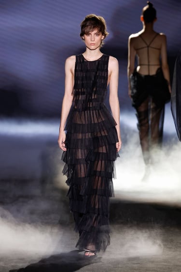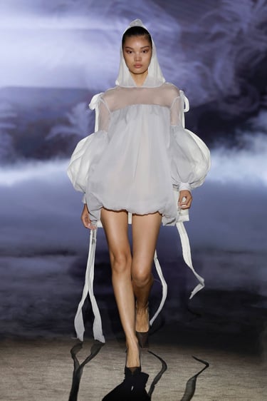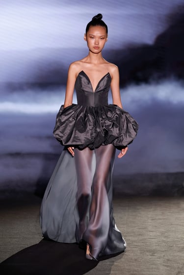 La colección, con siluetas audaces, tejidos dinámicos como organzas, tules, gasas deshilachadas.. y cortes dramáticos, simboliza el valor, el avance a pesar del miedo, la autenticidad, la celebración de la fuerza interior y de la ruptura de las barreras personales.