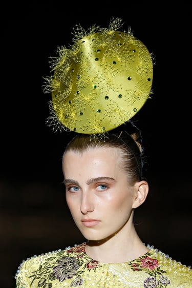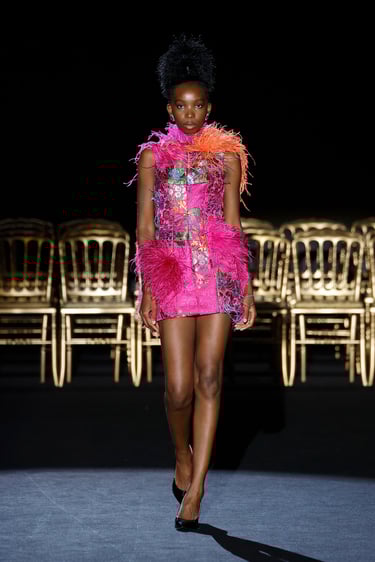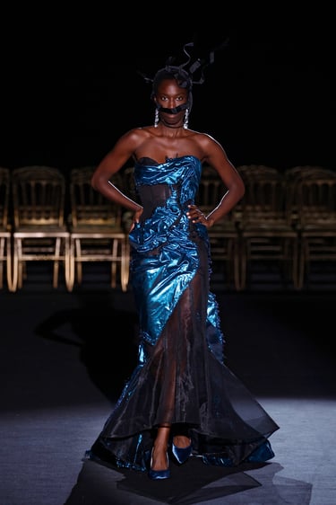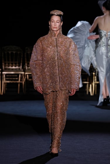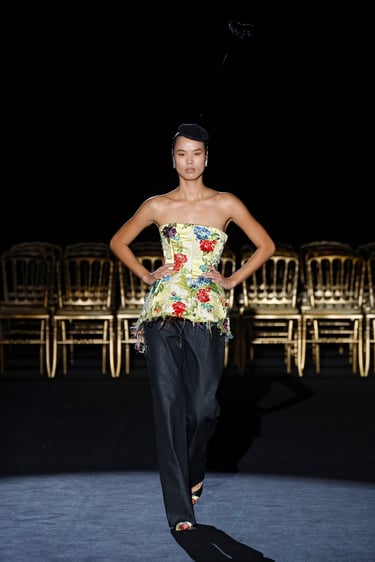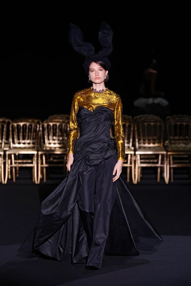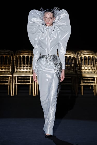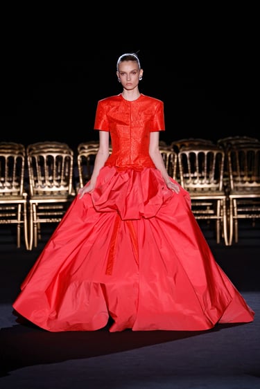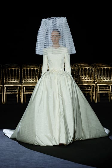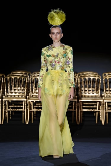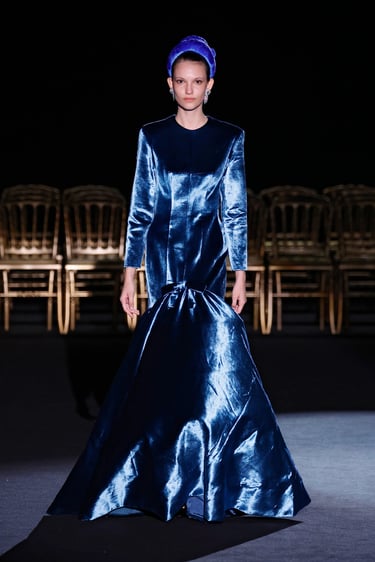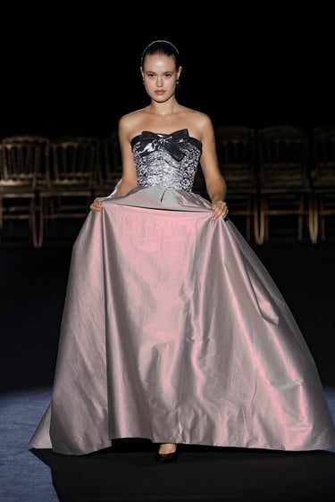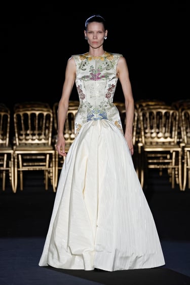 Compuesta por 18 looks femeninos, In Tempo recorre la tensión entre la estética clásica de la Alta Costura parisina y una reinterpretación contemporánea del oficio. La idea es clara: detener la prisa, reivindicar el trabajo meditado y realzar la durabilidad del gesto artesanal.