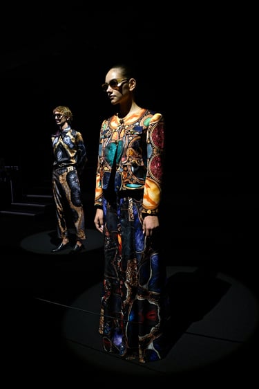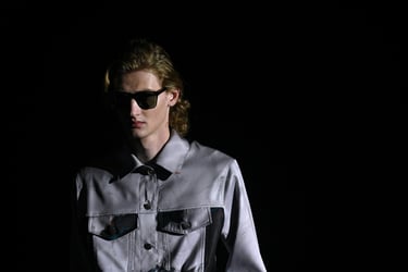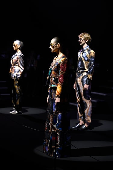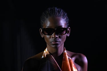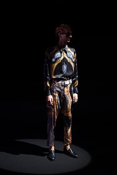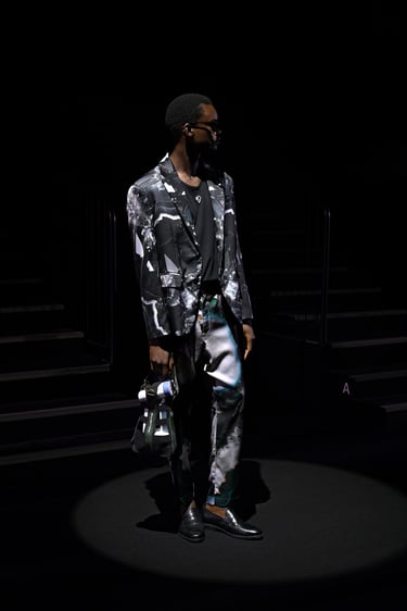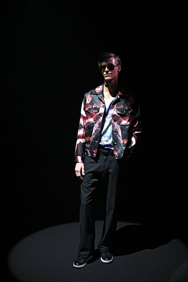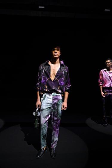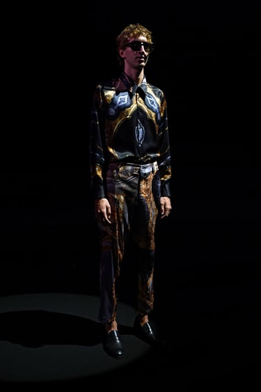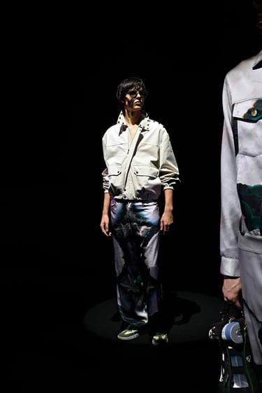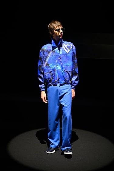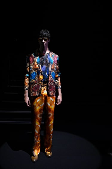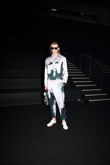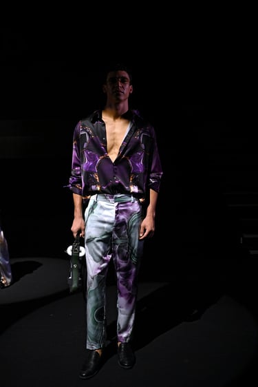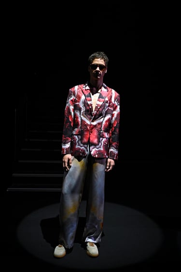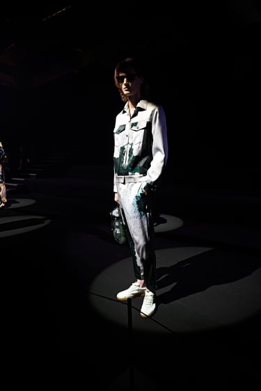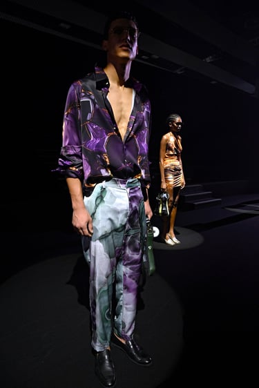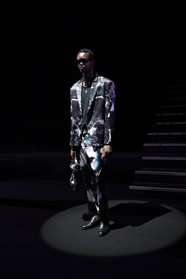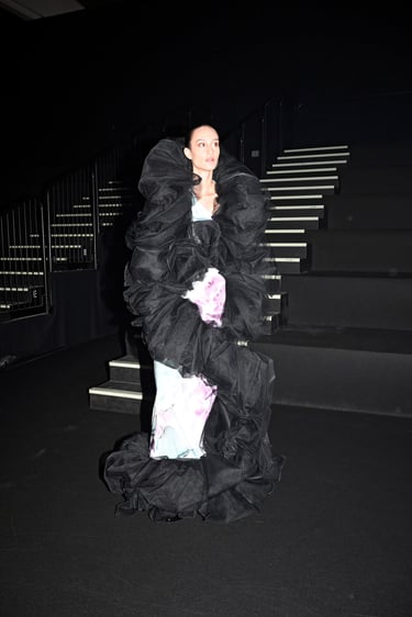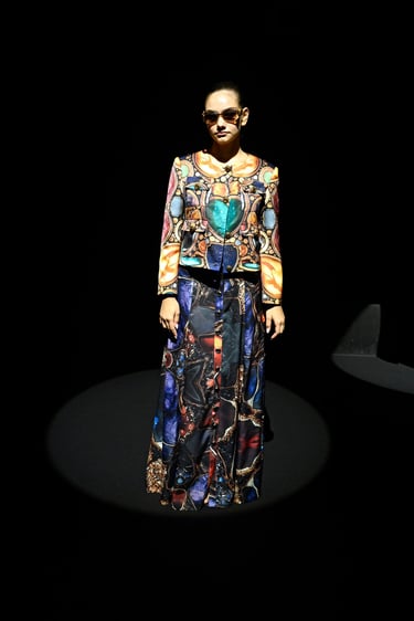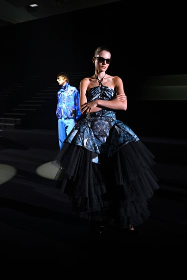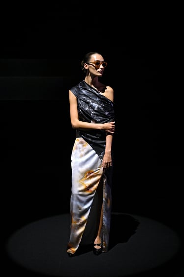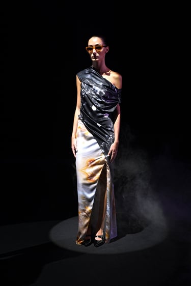 Después de esa cuidadosa performance, las modelos retomaron su rol habitual y desfiló la colección. Allí emergieron estampados inspirados en las rocas volcánicas de La Palma, acabados brillantes que evocaban diamantes, y tejidos dinámicos como crepé satén, sarga de algodón, tul y raso de seda. Los detalles ornamentales, como cristales estratégicos en espaldas o líneas de luz, reforzaron el mensaje: lo precioso emerge cuando ha sido sometido a presión.