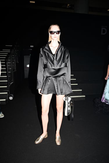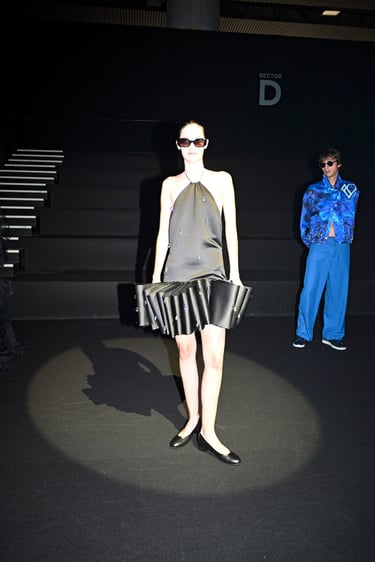 Este año la diseñadora canaria celebraba una década de trayectoria. La colección Under Pressure by Rowenta x Paloma Suárez rinde homenaje a su isla natal, La Palma, explorando su silueta como diamante o corazón. Pero Suárez no quería simplemente mirar atrás: su mirada era hacia adelante. En una ruptura con lo habitual, decidió que sus modelos no desfilarían al final; propuso una presentación estática que invitaba al público a acercarse al diseño, a sumergirse en cada pliegue, cada textura, cada detalle.