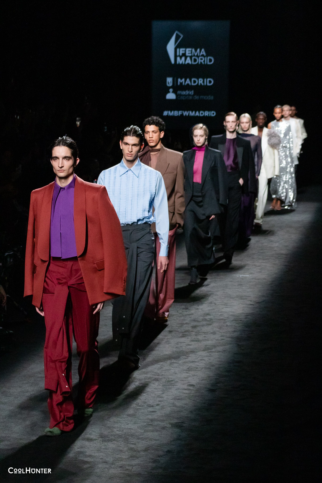 Si bien los tonos neutros predominan en la propuesta, Mans introduce rojos intensos y granates profundos, que otorgan fuerza y sofisticación a la colección. Además, la raya diplomática cobra protagonismo, consolidándose como una tendencia clave en la pasarela madrileña.