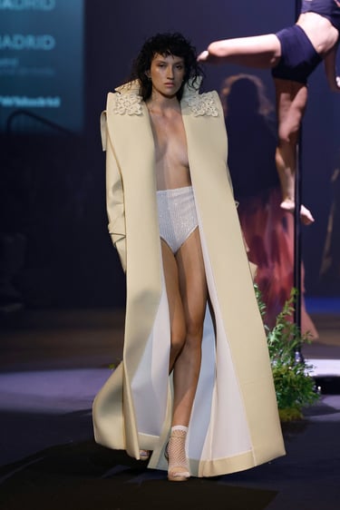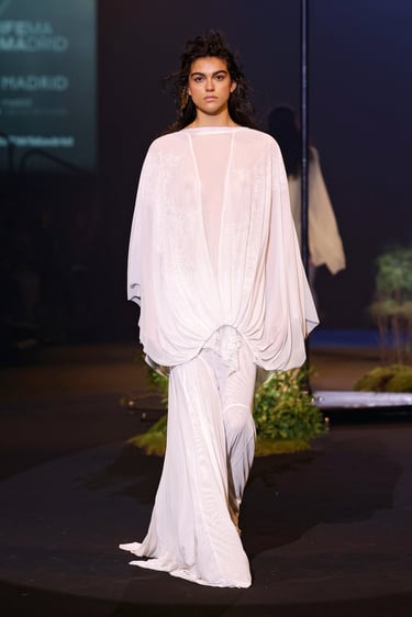 La propuesta de Lafuente no se limita a la estética: se despliega como un ejercicio de investigación textil, de innovación en materiales y de emoción contenida. Cada prenda parece tener vida propia sobre la pasarela, fluyendo, tensándose, desplegándose más allá del silencio del reposo.