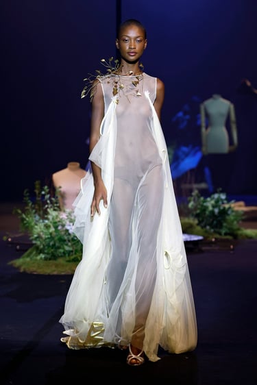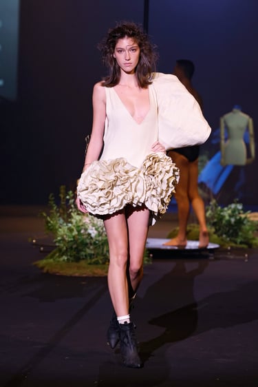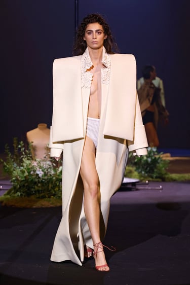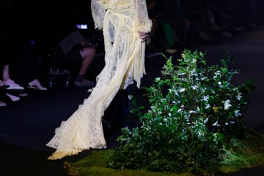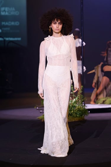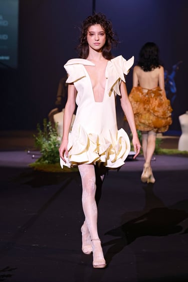 Lo que se vio en la pasarela fue una puesta en escena donde la forma y el gesto son protagonistas. Volúmenes escultóricos, superposiciones estratégicas, transparencias que sugieren y ocultamientos que despiertan miradas. Las texturas, en contraste, resaltan no solo por su diferencia visual, sino por su carga expresiva: un tul que vibra, un encaje que respira, un ganchillo que palpita.