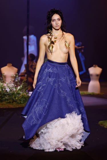 Este uso del color no es meramente decorativo: es narrativo. Cada tono dialoga con el tejido, con la luz escénica y con el movimiento inherente de las prendas, reforzando esa idea de “materia viva”.