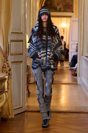 Vestidos tejidos que emergen bajo estructuras técnicas, prendas acolchadas que dialogan con capas translúcidas, piezas de punto artesanal superpuestas con tejidos tecnológicos: todo construye una silueta rica, compleja y profundamente contemporánea. La superposición no solo genera volumen y dinamismo, sino que refuerza el carácter emocional y narrativo de cada look.