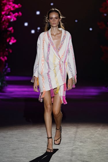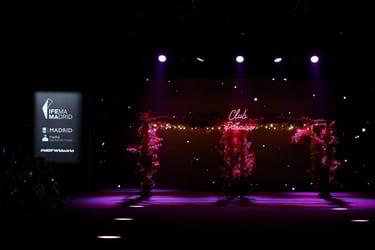 La pasarela del Ifema se transformó en un auténtico Club Paraíso, gracias a la dirección creativa de Inma Maynard, quien recreó un espacio cargado de buganvillas fucsias, vegetación exuberante y un neón en clave festiva. La música del DJ Alex del Toro completó la experiencia, generando esa atmósfera de verano sin principio ni fin que Odette buscaba transmitir.