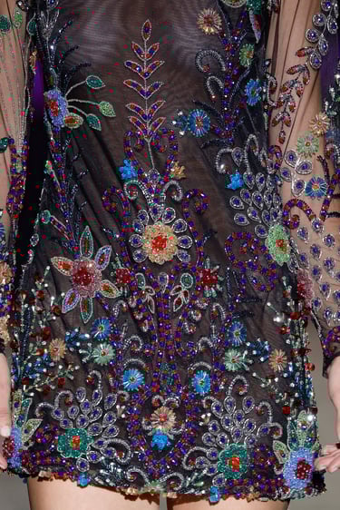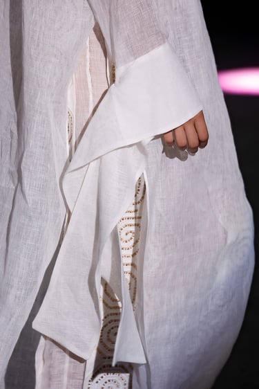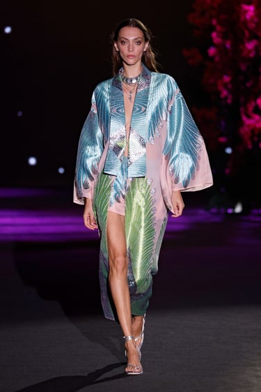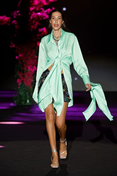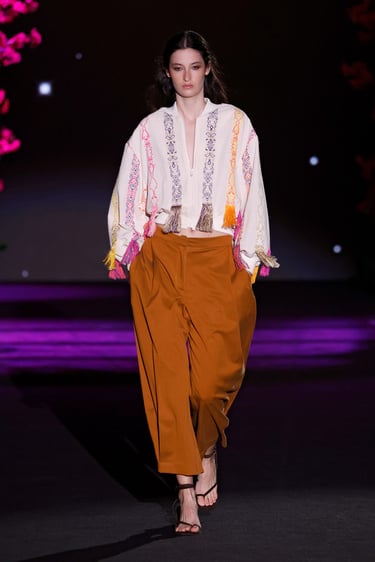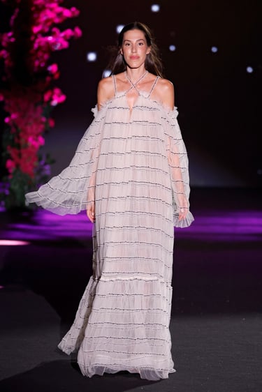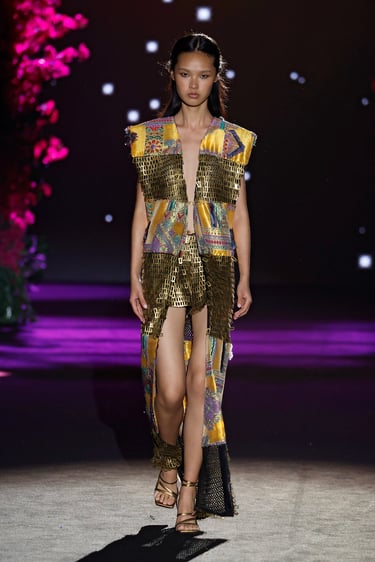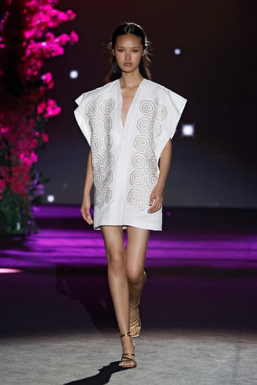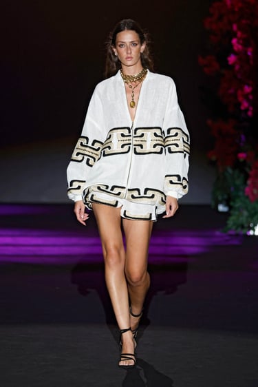 El universo textil de la colección se articula entre la ligereza del lino y el popelín —dos clásicos estivales reinterpretados en siluetas fluidas y camiseros con volumen— y la exuberancia de organza bordada, pedrería, chapas metálicas y aplicaciones artesanales. La colección despliega corsés que definen, kimonos bordados inspirados en el furisode japonés, bombers en lino combinadas con shorts y vestidos que flotan en caída libre, siempre fieles a la dualidad urbana y artesanal que distingue a Álvarez.