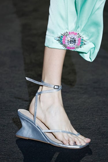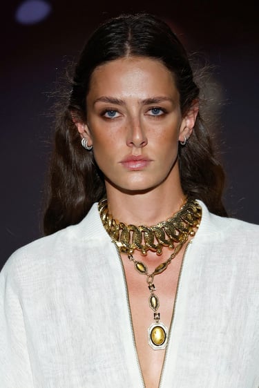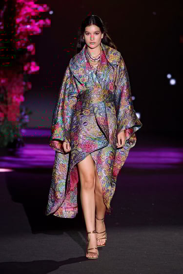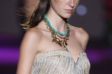 El color es protagonista absoluto. Dorados y plateados que capturan cada destello de luz conviven con turquesas intensos, rosas vibrantes y verdes luminosos, equilibrados por tonos tierra como chocolate y marfil. La propuesta cromática recuerda a un crepúsculo mediterráneo, donde lo metálico y lo orgánico se funden en armonía.