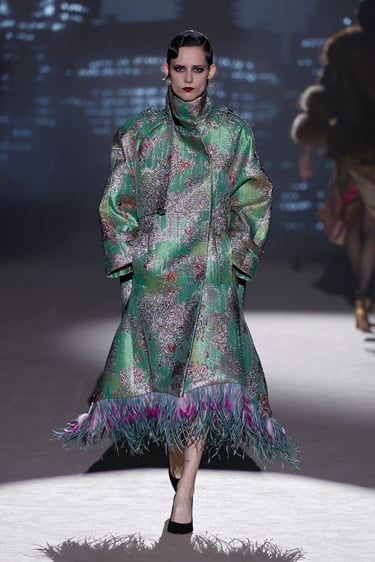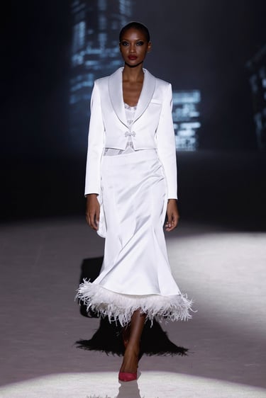 La paleta cromática se despliega con la suavidad de un susurro: blancos rotos, tonos empolvados, matices nude y pinceladas de luz que refuerzan ese imaginario romántico tan reconocible en la firma. Sin embargo, la colección introduce acentos cromáticos más intensos que irrumpen con intención, aportando carácter y una lectura más contemporánea a determinados looks, como si la fragilidad encontrara su contrapunto en la fuerza.