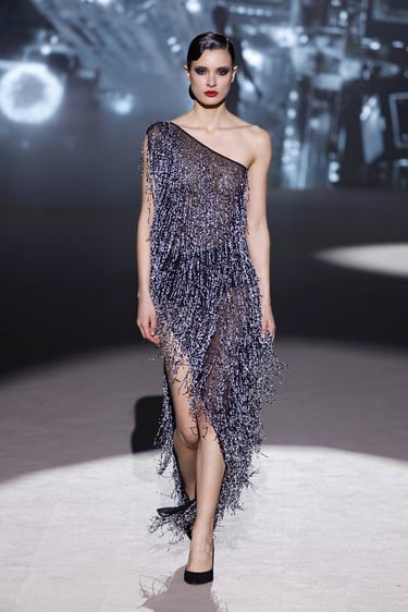 La pasarela se convierte en un escenario casi onírico donde la ligereza cobra protagonismo. Los tejidos, gasas etéreas, tules vaporosos y sutiles organzas envuelven el cuerpo con una naturalidad casi orgánica. Las siluetas, fluidas y envolventes, no imponen, sino que acompañan. Cada prenda parece moverse con quien la lleva, generando una sensación de libertad elegante que define el pulso de la colección.