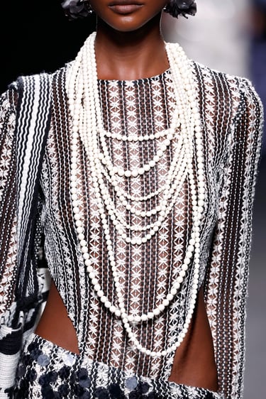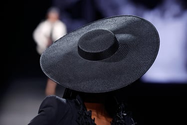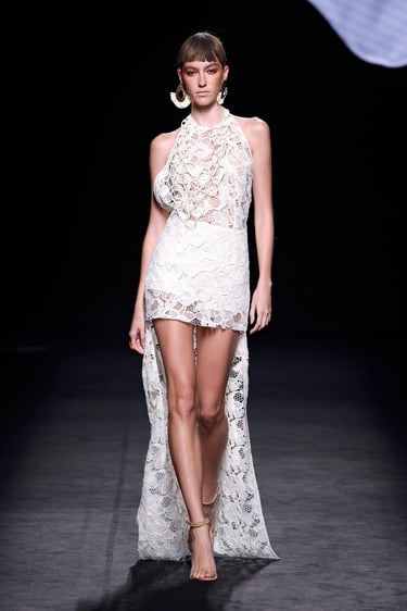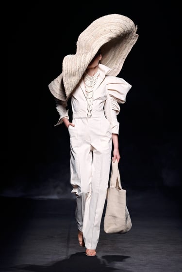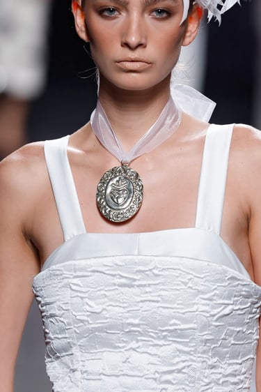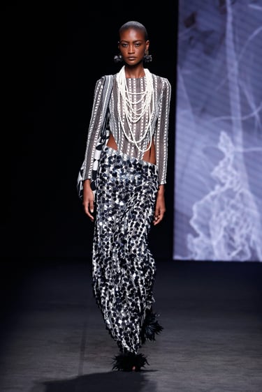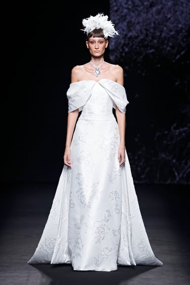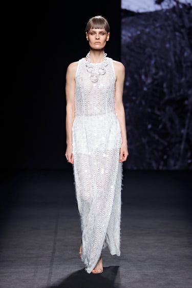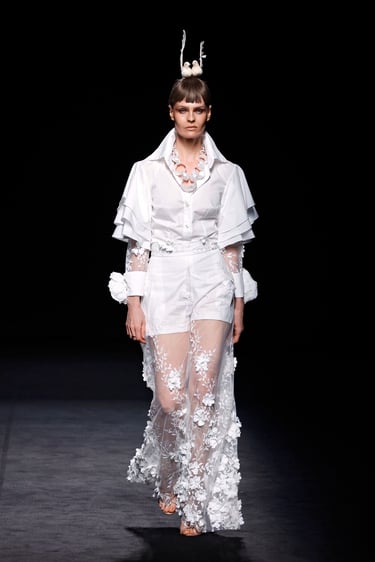 Una de las líneas maestras de esta propuesta reside en el tono. Malne traza un recorrido cromático que va del blanco impoluto, salpicado de flores bordadas y mariposas artesanales, al negro absoluto, tono insigne de la maison.