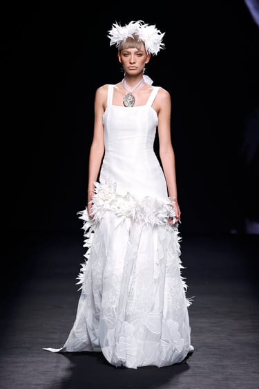 Pero no basta la tela: la magia está en el oficio. Los bordados en hilo metálico, las plumas ligeras, los motivos florales pintados, y las pinceladas (efecto acuarela) enriquecen las piezas con profundidad sensorial.
