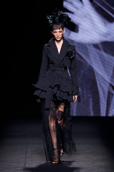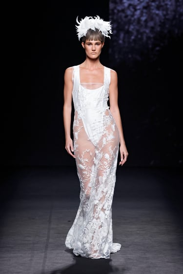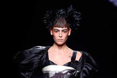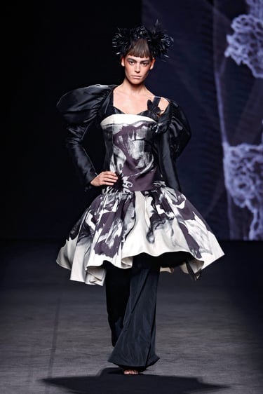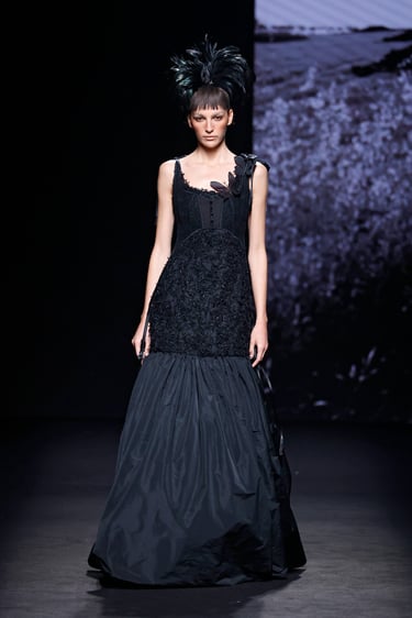 La colección navega entre formas escultóricas y contornos más fluidos. No es rígida ni monotemática: hay diálogo entre lo femenino y lo masculino, entre la geometría y la sensualidad. Las líneas rígidas de los corsés conviven con faldas volantes, mangas voluminosas o cortes inesperados.