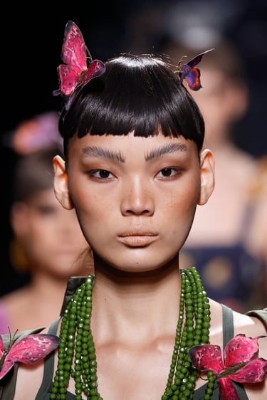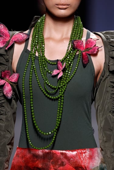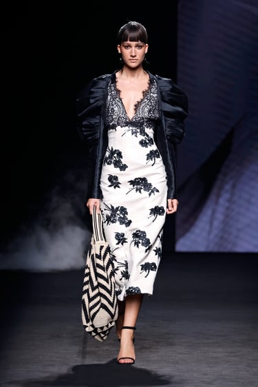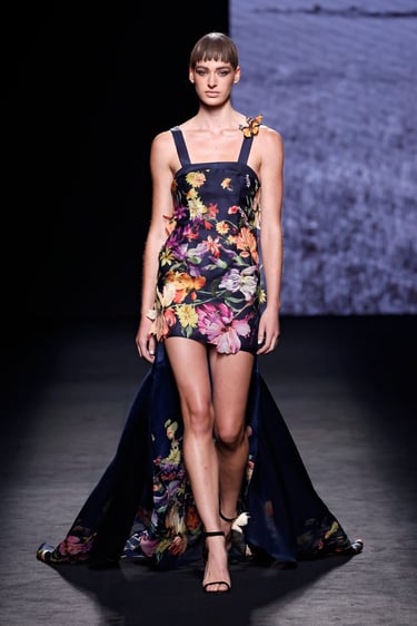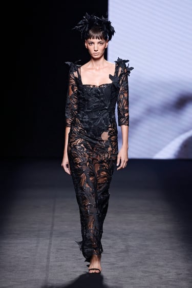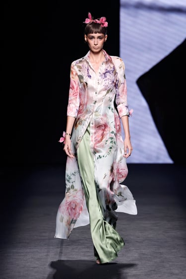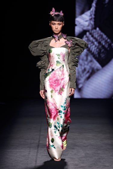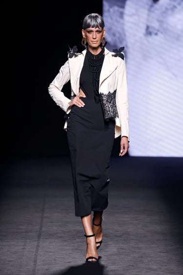 Entre esos dos polos, se asoman detalles vibrantes: motas florales, acuarelas (efecto wet painting), matices de tono metálico en los bordados. Las mariposas, símbolo recurrente, emergen en estampados, aplicaciones en relieve o como remates que cobran protagonismo.