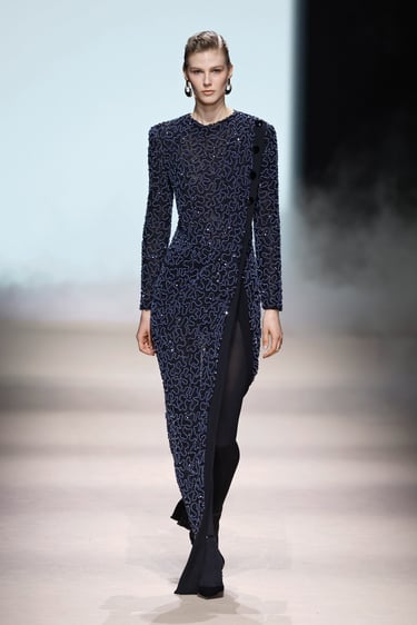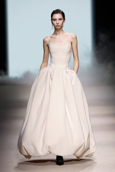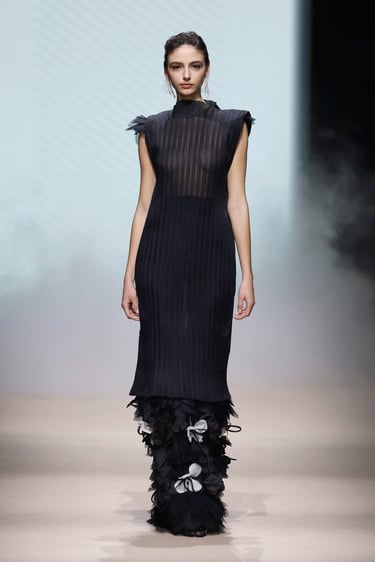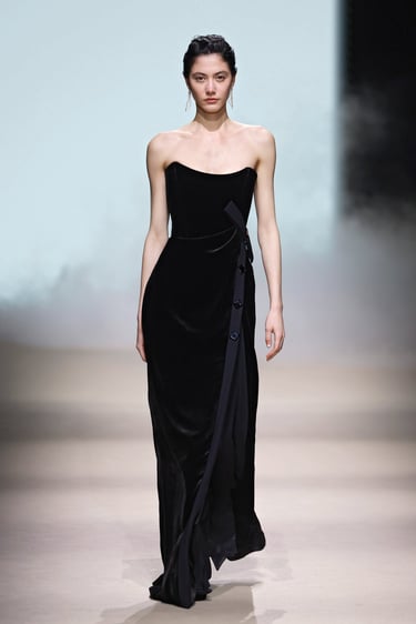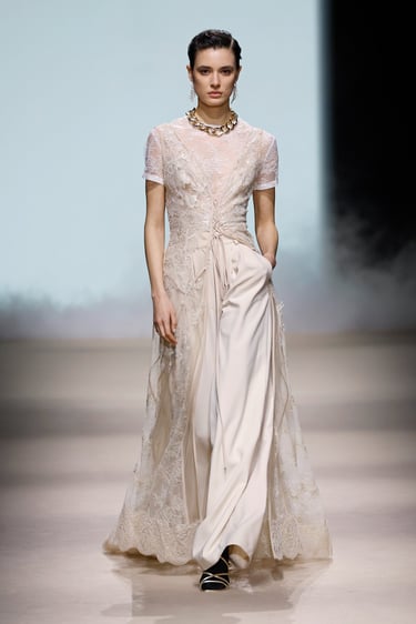 La propuesta se despliega en una narrativa de siluetas envolventes y alargadas que acarician el cuerpo con una elegancia serena. Vestidos de caída fluida conviven con conjuntos de pantalón que rompen con la idea tradicional de la costura, aportando una mirada contemporánea sin perder la esencia artesanal. Es precisamente en este equilibrio donde reside la fuerza de la colección.