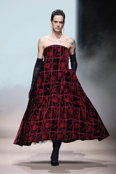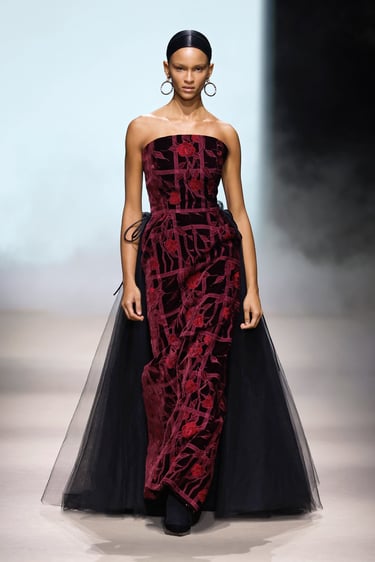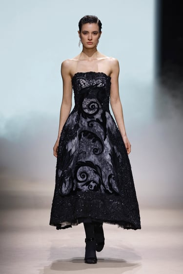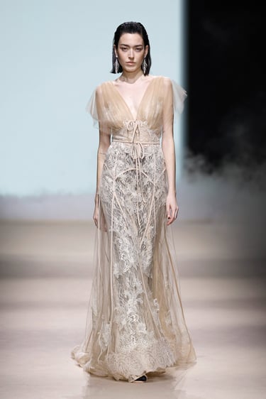 Los tejidos, como es habitual en Yolancris, son protagonistas absolutos. El terciopelo emerge con una presencia rotunda, aportando profundidad y sofisticación, mientras que los encajes trabajados con minuciosidad revelan la herencia romántica de la firma. Bordados realizados íntegramente a mano y aplicaciones florales generan un juego de volúmenes y relieves que transforma cada prenda en una pieza casi escultórica.